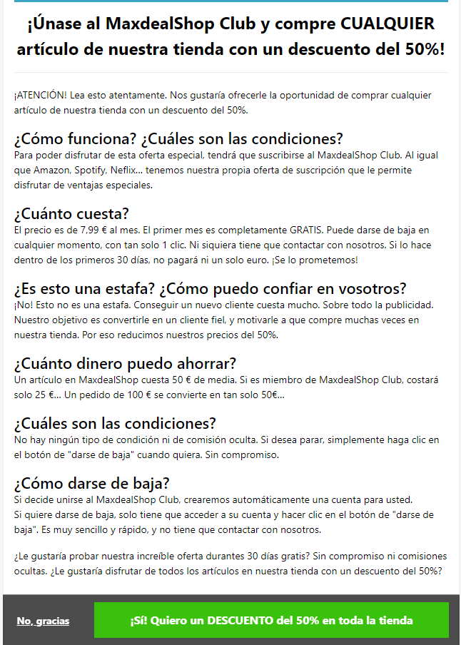 Como recordatorio, esta es la página donde decidió suscribirse al Club de MaxdealShop.